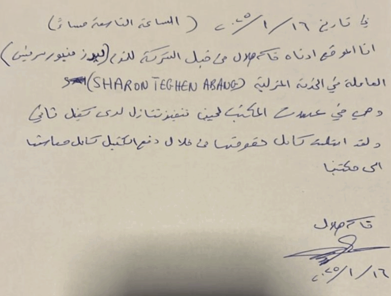 Negotiations with the employers and agents dragged on for months. In February 2025, Sharon was repatriated to Cameroon. She left Lebanon without the wages she worked for. Only $300 was recovered from the Cameroon agent. Ahmad and Kassem Hilal, unregistered ‘brokers’ (essentially slave-traders), had Marwan sign a document claiming he had paid Sharon’s salary in full - a lie.